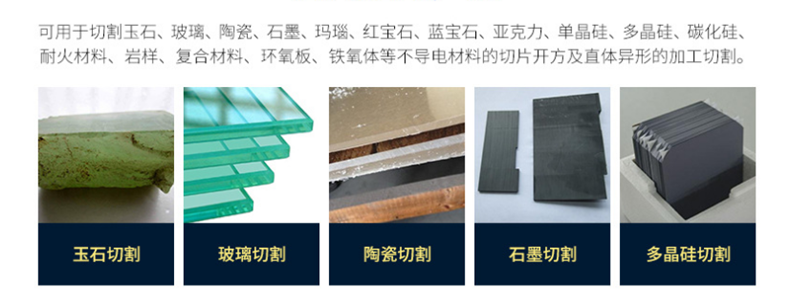 應(yīng)用范圍:可用于硬脆材料的異性和切片加工,如:石墨、陶瓷、玻璃、藍(lán)寶石、單晶硅、多晶硅、寶石等材料。